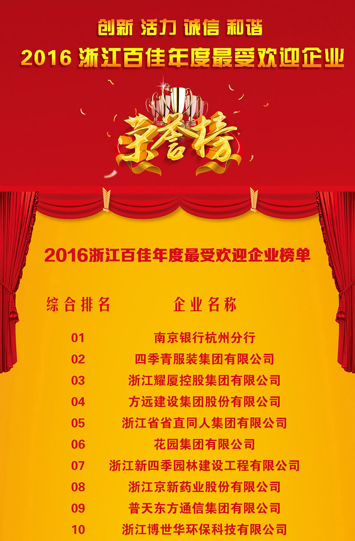 為推動浙江省企業的誠信和諧經營,增添企業的創新發展活力和動力,由浙江經濟網、新華網浙江頻道主辦,由中共浙江省委政法委員會、浙江省人大內務司法委員會、浙江省人民檢察院、浙江省科學技術廳、浙江省公安廳、浙江省環境保護廳、浙江省住房和城鄉建設廳、浙江省國家稅務局、浙江省政協經濟委員會、浙江省總工會、新華網等單位指導,于2016年12月聯合舉辦的“2016浙江百佳年度最受歡迎企業” 榮譽榜推選活動日前揭曉,我公司在眾多參評企業中脫穎而出,取得了第十名的佳績。