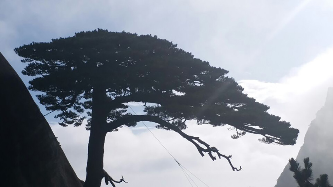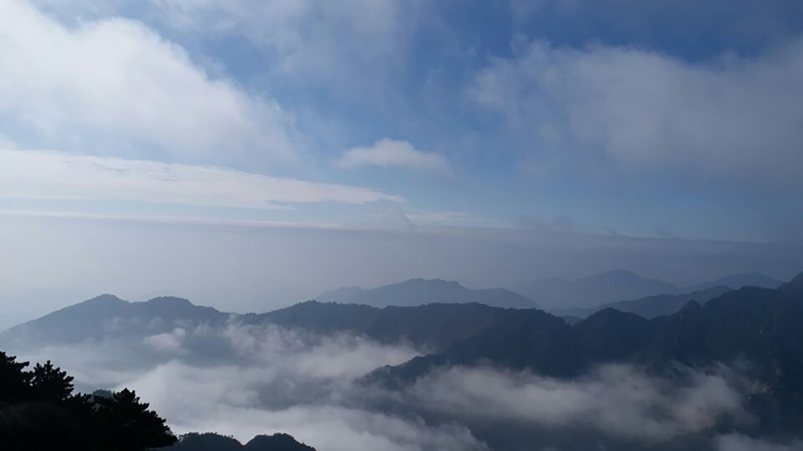 經(jīng)過漫長(zhǎng)的排隊(duì)等候我們終于坐上了上山的纜車。隨著纜車的慢慢高升,纜車外霧氣越來越深,穿過云層后看到黃山的真面目,黃山上特有的松樹正向我們伸出手來歡迎我們呢! 真是好美啊!