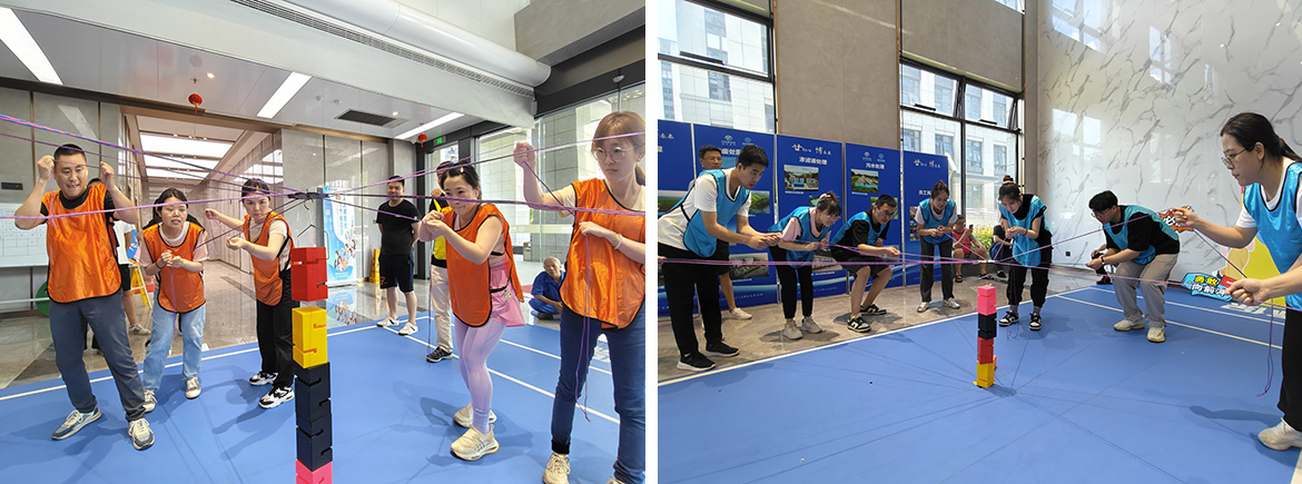 合力搭建拓展游戲,團隊所有成員通過手拉繩子控制吊板進行盒子的累加操作,最后搭疊最高且沒倒的隊伍獲勝!