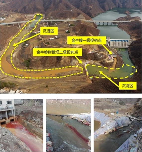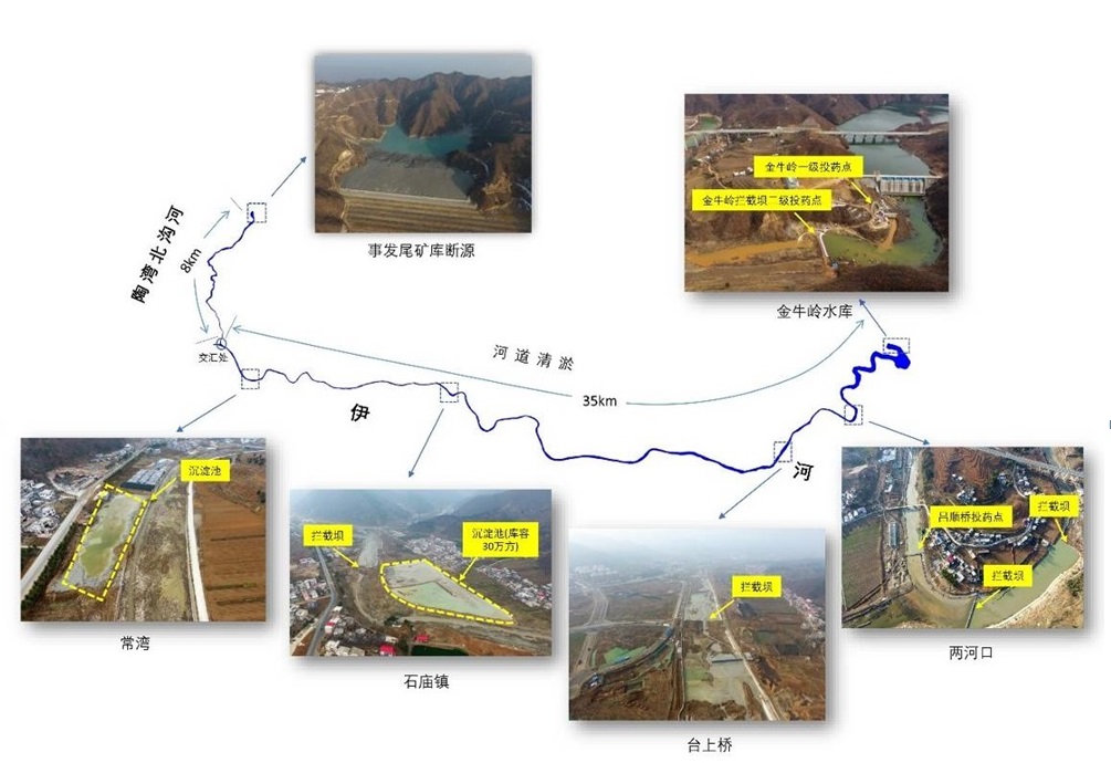 筑壩攔截。2月15日開(kāi)始,欒川縣人民政府組織在伊河受影響的35公里干流河道分段設(shè)置攔截壩、開(kāi)挖臨時(shí)沉淀池,在攔截污染水體、調(diào)節(jié)下泄流量、為投藥降污創(chuàng)造有利條件等方面發(fā)揮重要作用。